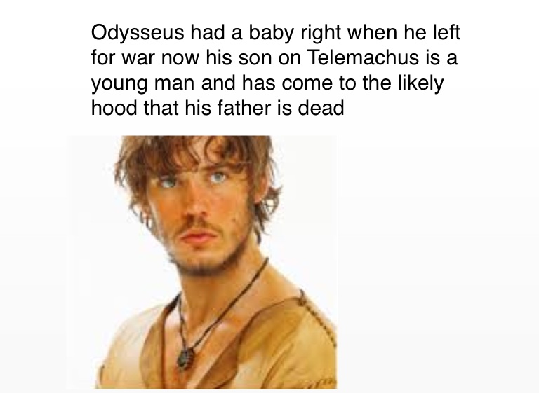 Odysseus had a baby right when he left for war now his son on Telemachus is a young man and has come to the likely hood that his father is dead