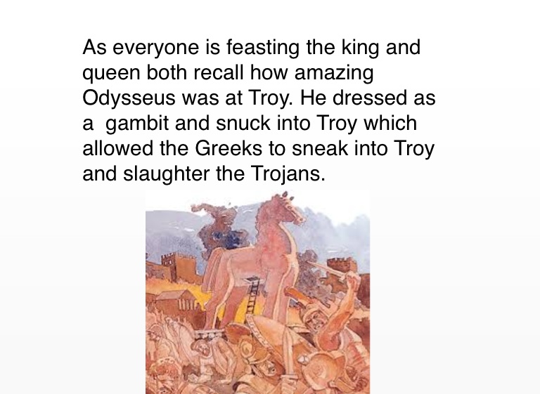 As everyone is feasting the king and queen both recall how amazing Odysseus was at Troy. He dressed as a gambit and snuck into Troy which allowed the Greeks to sneak into Troy and slaughter the Trojans.