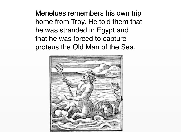 Menelues remembers his own trip home from Troy. He told them that he was stranded in Egypt and that he was forced to capture proteus the Old Man of the Sea.