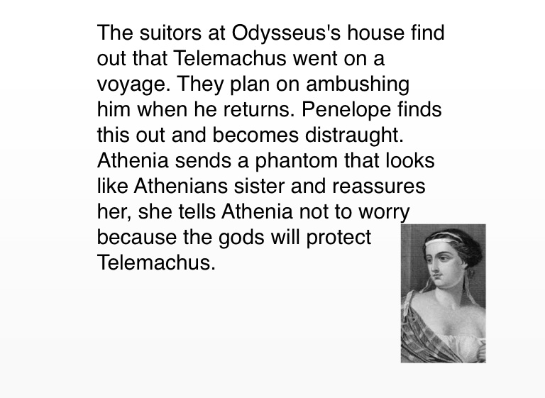 The suitors at Odysseus's house find out that Telemachus went on a voyage. They plan on ambushing him when he returns. Penelope finds this out and becomes distraught. Athenia sends a phantom that looks like Athenians sister and reassures her, she tells Athenia not to worry because the gods will protect Telemachus.