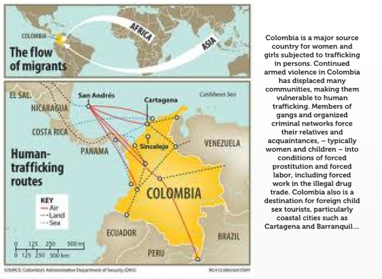 Colombia is a major source country for women and girls subjected to trafficking in persons. Continued armed violence in Colombia has displaced many communities, making them vulnerable to human trafficking. Members of gangs and organized criminal networks force their relatives and acquaintances, – typically women and children – into conditions of forced prostitution and forced labor, including forced work in the illegal drug trade. Colombia also is a destination for foreign child sex tourists, particularly coastal cities such as Cartagena and Barranquilla.