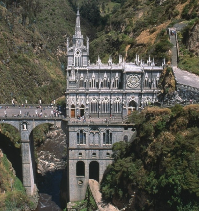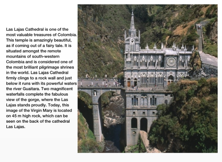 Las Lajas Cathedral is one of the most valuable treasures of Colombia. This temple is amazingly beautiful, as if coming out of a fairy tale. It is situated amongst the remote mountains of south-western Colombia and is considered one of the most brilliant pilgrimage shrines in the world. Las Lajas Cathedral firmly clings to a rock wall and just below it runs with its powerful waters the river Guaitara. Two magnificent waterfalls complete the fabulous view of the gorge, where the Las Lajas stands proudly. Today, this image of the Virgin Mary is located on 45 m high rock, which can be seen on the back of the cathedral Las Lajas.