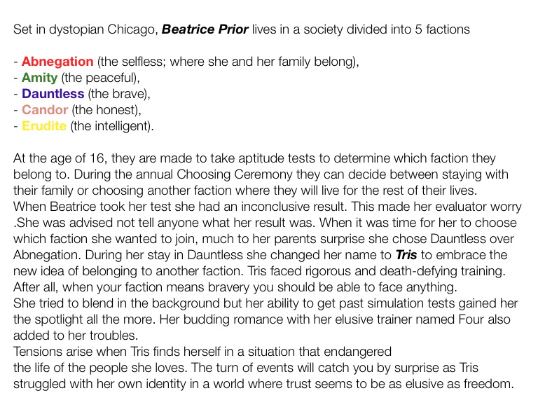 Set in dystopian Chicago, Beatrice Prior lives in a society divided into 5 factions