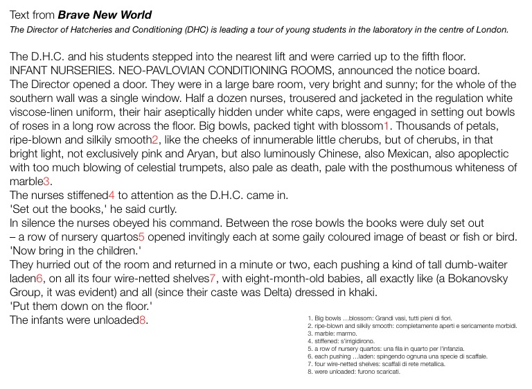 The Director opened a door. They were in a large bare room, very bright and sunny; for the whole of the southern wall was a single window. Half a dozen nurses, trousered and jacketed in the regulation white viscose-linen uniform, their hair aseptically hidden under white caps, were engaged in setting out bowls of roses in a long row across the floor. Big bowls, packed tight with blossom1. Thousands of petals, ripe-blown and silkily smooth2, like the cheeks of innumerable little cherubs, but of cherubs, in that bright light, not exclusively pink and Aryan, but also luminously Chinese, also Mexican, also apoplectic with too much blowing of celestial trumpets, also pale as death, pale with the posthumous whiteness of marble3.