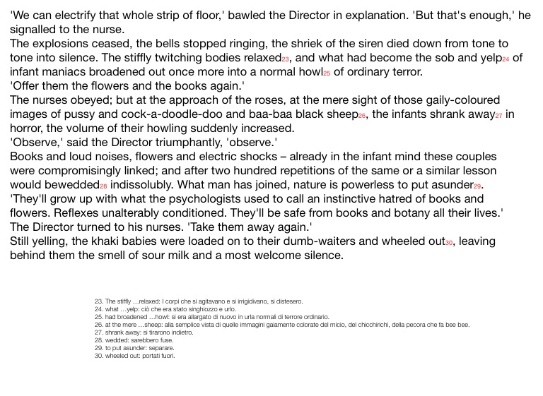 'We can electrify that whole strip of floor,' bawled the Director in explanation. 'But that's enough,' he signalled to the nurse.