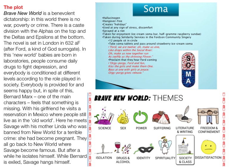Brave New World is a benevolent dictatorship: in this world there is no war, poverty or crime. There is a caste division with the Alphas on the top and the Deltas and Epsilons at the bottom. The novel is set in London in 632 aF (after Ford, a kind of God surrogate). In this 'new world' babies are born in laboratories, people consume daily drugs to fight depression, and everybody is conditioned at different levels according to the role played in society. Everybody is provided for and seems happy but, in spite of this, Bernard Marx – one of the main characters – feels that something is missing. With his girlfriend he visits a reservation in Mexico where people still live as in the 'old world'. Here he meets Savage with his mother Linda who was banned from New World for a terrible crime: she had become pregnant. They all go back to New World where Savage become famous. But after a while he isolates himself. While Bernard is exiled, Savage hangs himself.