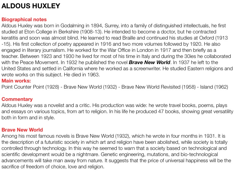 Aldous Huxley was born in Godalming in 1894, Surrey, into a family of distinguished intellectuals, he first studied at Eton College in Berkshire (1908-13). He intended to become a doctor, but he contracted keratitis and soon was almost blind. He learned to read Braille and continued his studies at Oxford (1913 -15). His first collection of poetry appeared in 1916 and two more volumes followed by 1920. He also engaged in literary journalism. He worked for the War Office in London in 1917 and then briefly as a teacher. Between 1923 and 1930 he lived for most of his time in Italy and during the 30ies he collaborated with the Peace Movement. In 1932 he published the novel Brave New World. In 1937 he left to the United States and settled in California where he worked as a screenwriter. He studied Eastern religions and wrote works on this subject. He died in 1963.