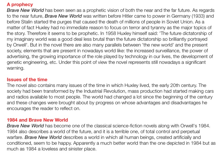 Brave New World has been seen as a prophetic vision of both the near and the far future. As regards