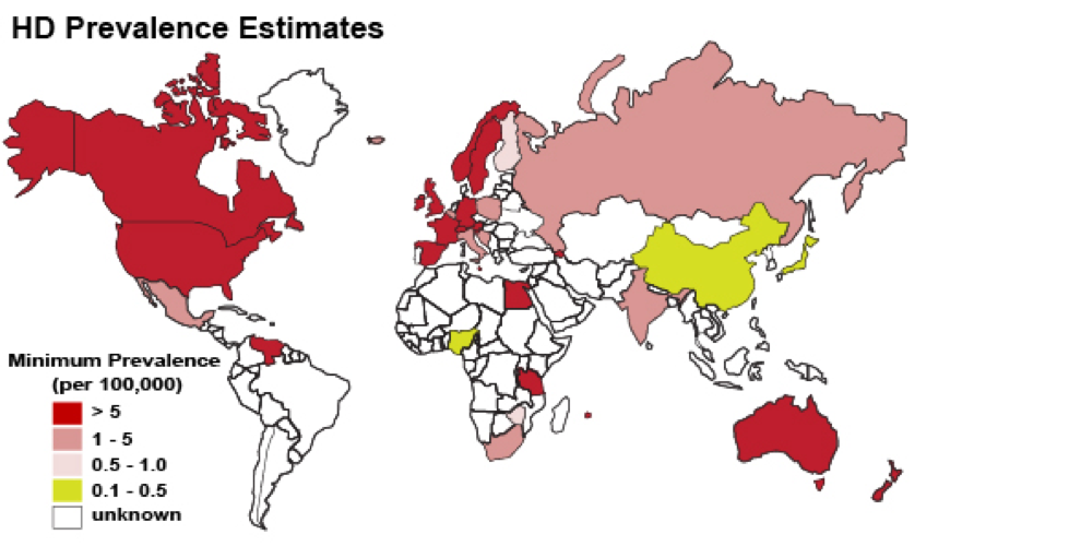 Huntington disease affects about 3 to 7 people per 100,000 people of European ancestry. The disorder appears to be less common in some other populations, including people of Japanese, Chinese, and African descent.