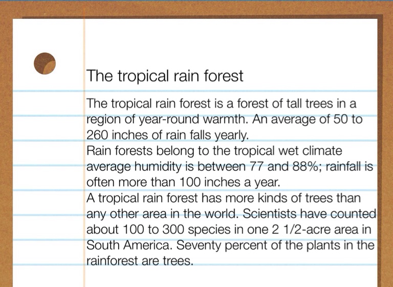 The tropical rain forest is a forest of tall trees in a region of year-round warmth. An average of 50 to 260 inches of rain falls yearly.