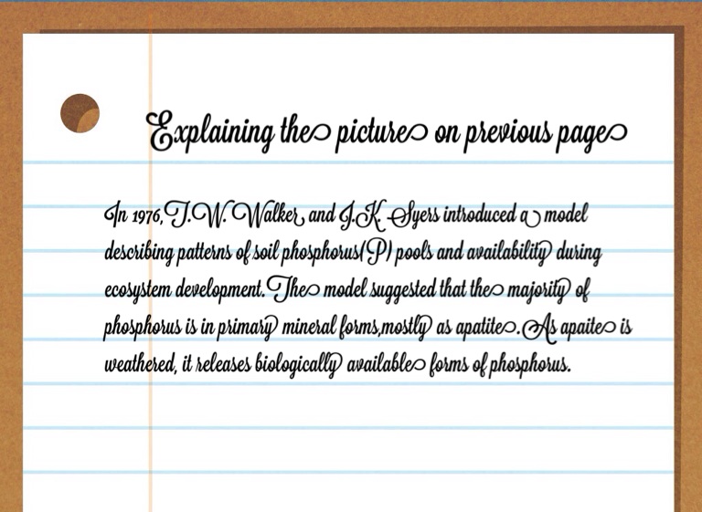 In 1976,T.W. Walker and J.K. Syers introduced a model describing patterns of soil phosphorus(P) pools and availability during ecosystem development.The model suggested that the majority of phosphorus is in primary mineral forms,mostly as apatite.As apaite is weathered, it releases biologically available forms of phosphorus.