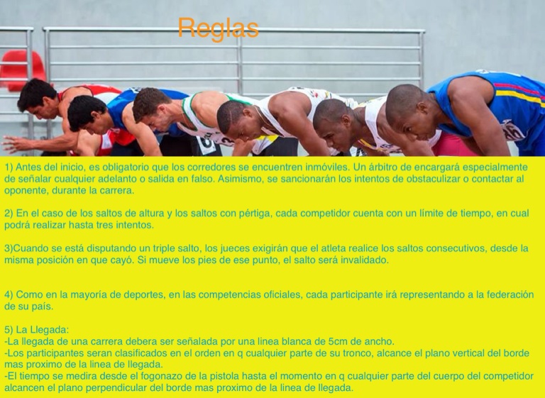 -El tiempo se medira desde el fogonazo de la pistola hasta el momento en q cualquier parte del cuerpo del competidor alcancen el plano perpendicular del borde mas proximo de la linea de llegada.