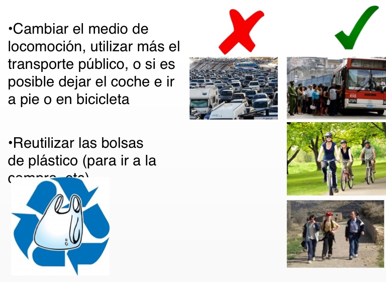 •Cambiar el medio de locomoción, utilizar más el transporte público, o si es posible dejar el coche e ir a pie o en bicicleta