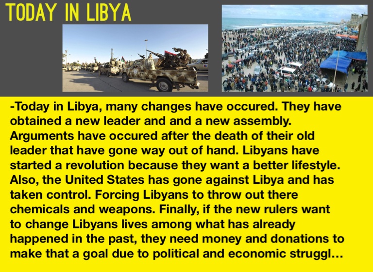 -Today in Libya, many changes have occured. They have obtained a new leader and and a new assembly. Arguments have occured after the death of their old leader that have gone way out of hand. Libyans have started a revolution because they want a better lifestyle. Also, the United States has gone against Libya and has taken control. Forcing Libyans to throw out there chemicals and weapons. Finally, if the new rulers want to change Libyans lives among what has already happened in the past, they need money and donations to make that a goal due to political and economic struggles.