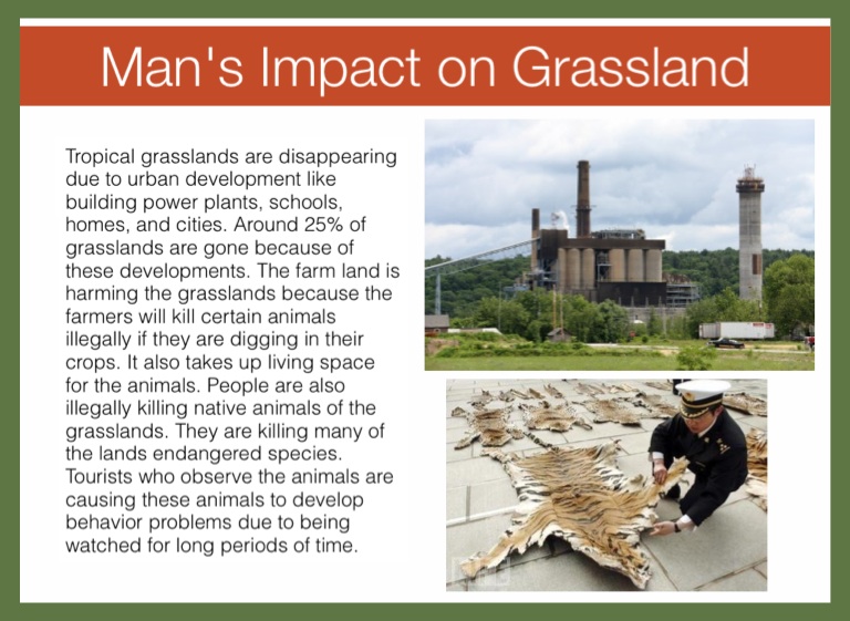 Tropical grasslands are disappearing due to urban development like building power plants, schools, homes, and cities. Around 25% of grasslands are gone because of these developments. The farm land is harming the grasslands because the farmers will kill certain animals illegally if they are digging in their crops. It also takes up living space for the animals. People are also illegally killing native animals of the grasslands. They are killing many of the lands endangered species. Tourists who observe the animals are causing these animals to develop behavior problems due to being watched for long periods of time.