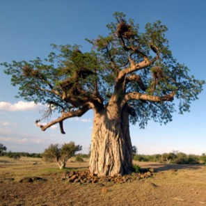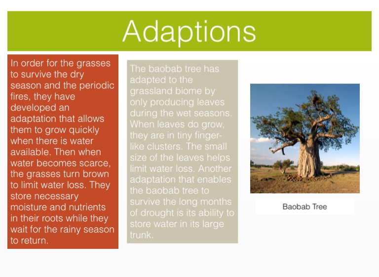 The baobab tree has adapted to the grassland biome by only producing leaves during the wet seasons. When leaves do grow, they are in tiny finger-like clusters. The small size of the leaves helps limit water loss. Another adaptation that enables the baobab tree to survive the long months of drought is its ability to store water in its large trunk.