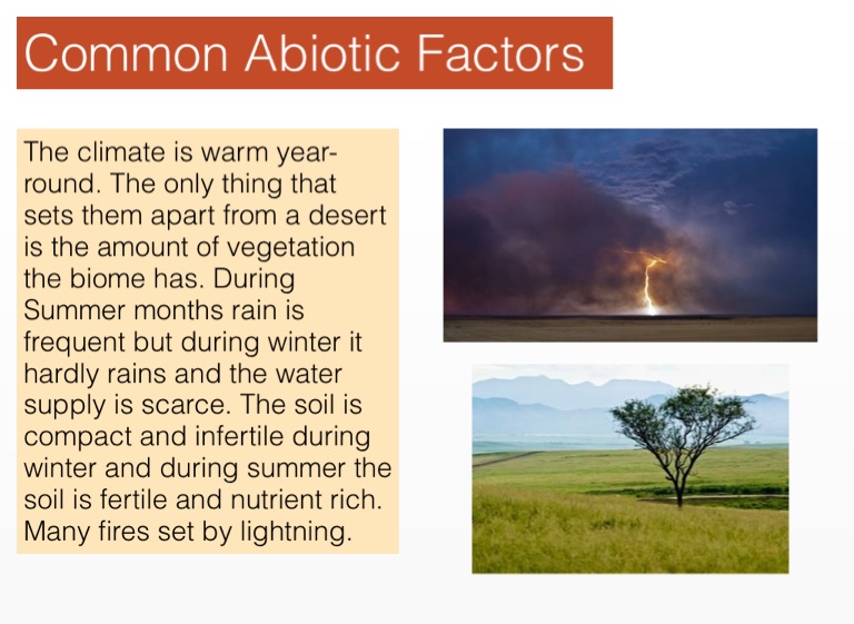 The climate is warm year-round. The only thing that sets them apart from a desert is the amount of vegetation the biome has. During Summer months rain is frequent but during winter it hardly rains and the water supply is scarce. The soil is compact and infertile during winter and during summer the soil is fertile and nutrient rich. Many fires set by lightning.