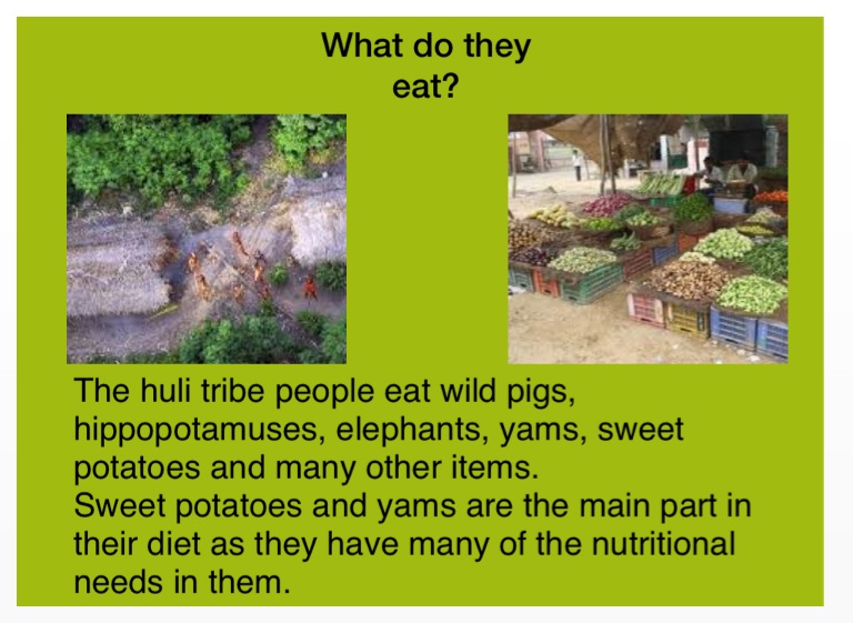 The huli tribe people eat wild pigs, hippopotamuses, elephants, yams, sweet potatoes and many other items.