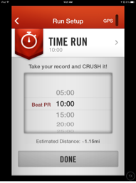 Select the distance you would like to run, and the app will tell you your estimated time based on past runs. Press "done" and you will be taken back to previous screen