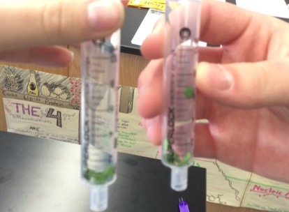 5- Pull 5 mL of the "With CO2" into one syringe and 5 mL of the plain water into the other. Tap the syringe until all of the disks are floating at the top of the solution.