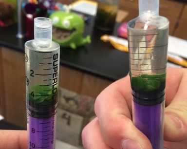 7- Now we are going to create a vaccuum. Hold your finger over the opening of the syringe and slowly pull out the plunger. Hold for ten seconds while swirling the leaves around inside. Now release the plunger, it will snap back, and wait until the disks sink in the syringe before removing your finger.
