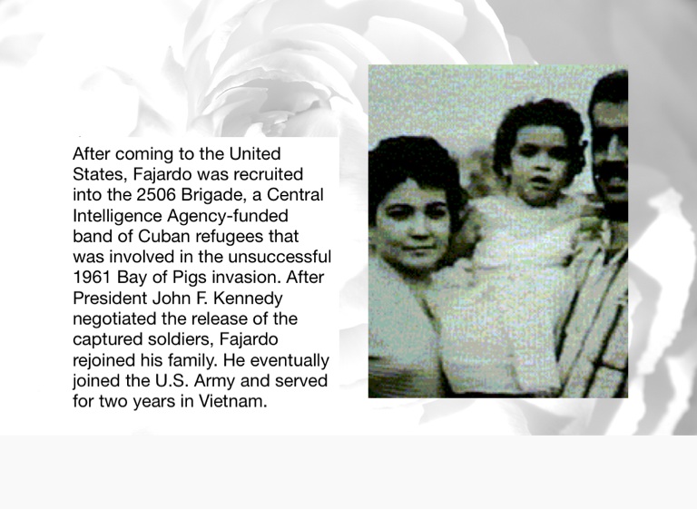 After coming to the United States, Fajardo was recruited into the 2506 Brigade, a Central Intelligence Agency-funded band of Cuban refugees that was involved in the unsuccessful 1961 Bay of Pigs invasion. After President John F. Kennedy negotiated the release of the captured soldiers, Fajardo rejoined his family. He eventually joined the U.S. Army and served for two years in Vietnam.