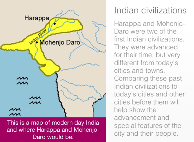 Harappa and Mohenjo-Daro were two of the first Indian civilizations. They were advanced for their time, but very different from today's cities and towns. Comparing these past Indian civilizations to today's cities and other cities before them will help show the advancement and special features of the city and their people.