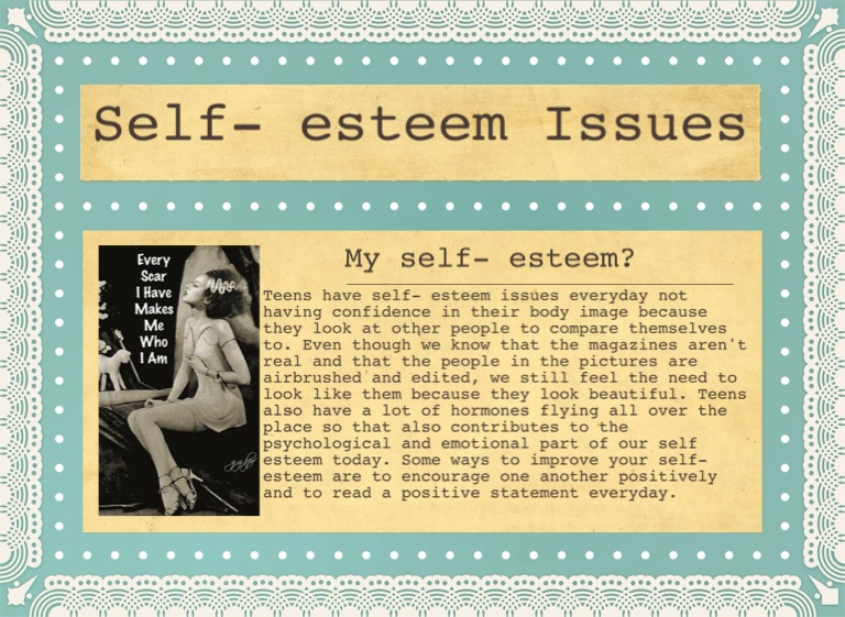 Teens have self- esteem issues everyday not having confidence in their body image because they look at other people to compare themselves to. Even though we know that the magazines aren't real and that the people in the pictures are airbrushed and edited, we still feel the need to look like them because they look beautiful. Teens also have a lot of hormones flying all over the place so that also contributes to the psychological and emotional part of our self esteem today. Some ways to improve your self- esteem are to encourage one another positively and to read a positive statement everyday.