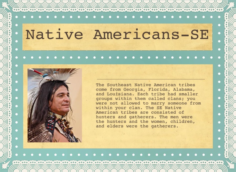 The Southeast Native American tribes come from Georgia, Florida, Alabama, and Louisiana. Each tribe had smaller groups within them called clans; you were not allowed to marry someone from within your clan. The SE Native American tribes are consisted of hunters and gatherers. The men were the hunters and the women, children, and elders were the gatherers.