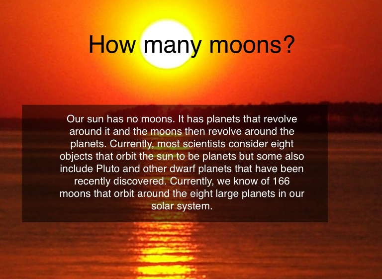 Our sun has no moons. It has planets that revolve around it and the moons then revolve around the planets. Currently, most scientists consider eight objects that orbit the sun to be planets but some also include Pluto and other dwarf planets that have been recently discovered. Currently, we know of 166 moons that orbit around the eight large planets in our solar system.