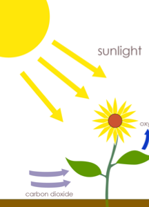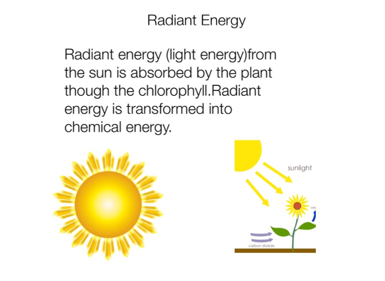 Radiant energy (light energy)from the sun is absorbed by the plant though the chlorophyll.Radiant energy is transformed into chemical energy.
