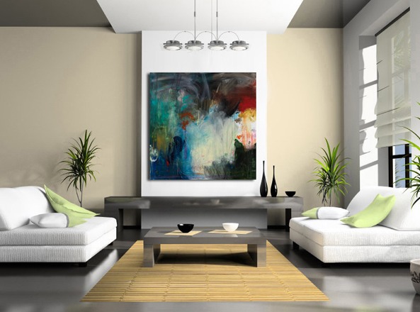 Emphasis is also known as the "center of interest" or "focal point." In this picture, the brightly colored abstract painting in the middle of the room is the emphasis. The painting creates order and draws attention to one main focus. After the eye is first drawn to the painting, it then allows rhythm to draw the eye out to the rest of the room. Since the focal point is brightly colored and the rest of the room is very monochromatic, after the eye is done looking at the painting, it is drawn out to the rest of the bland room.