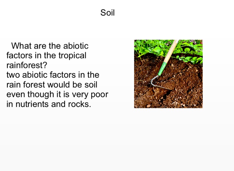 two abiotic factors in the rain forest would be soil even though it is very poor in nutrients and rocks.