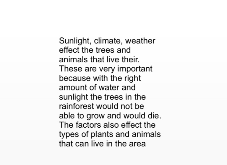 Sunlight, climate, weather effect the trees and animals that live their. These are very important because with the right amount of water and sunlight the trees in the rainforest would not be able to grow and would die. The factors also effect the types of plants and animals that can live in the area