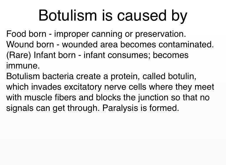 Botulism bacteria create a protein, called botulin, which invades excitatory nerve cells where they meet with muscle fibers and blocks the junction so that no signals can get through. Paralysis is formed.