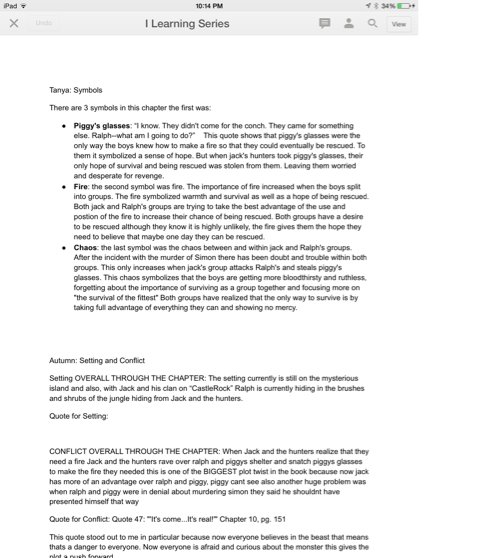 Symbol: symbol is a item or figure that represents something more than what the reader sees it as. Below you can see the example about Piggy's glasses because he needed those to see and so the boys could fire so you see that his glasses were worth more than what the reader thought.
