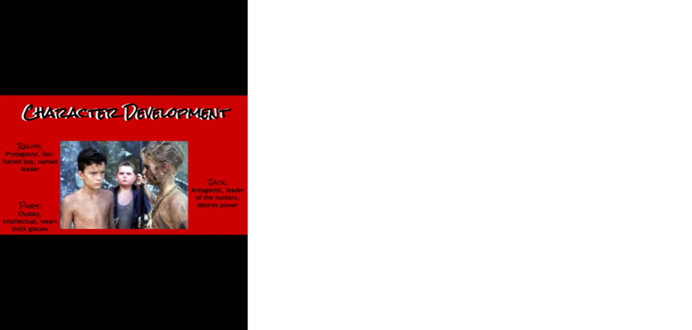 Character: character shows how the person is being portrayed and character shows how the person is set up to be by providing describing or certain scenes. Just down below the example shows how Ralph piggy and jack are being portrayed in our eyes.