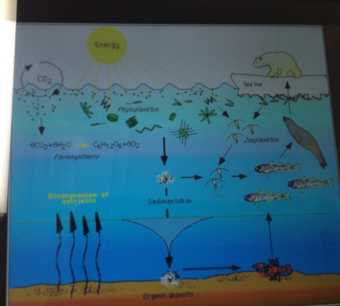Carbon dioxide - algae - photosynthesis- decompose- lobster- fish-seal-polar bear- cellular respiration.