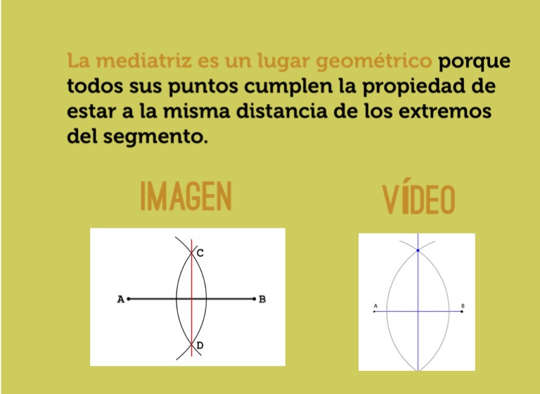La mediatriz es un lugar geométrico porque todos sus puntos cumplen la propiedad de estar a la misma distancia de los extremos del segmento.