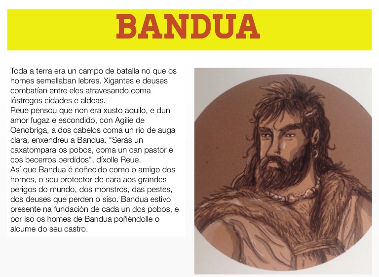 Así que Bandua é coñecido como o amigo dos homes, o seu protector de cara aos grandes perigos do mundo, dos monstros, das pestes, dos deuses que perden o siso. Bandua estivo presente na fundación de cada un dos pobos, e por iso os homes de Bandua poñéndolle o alcume do seu castro.