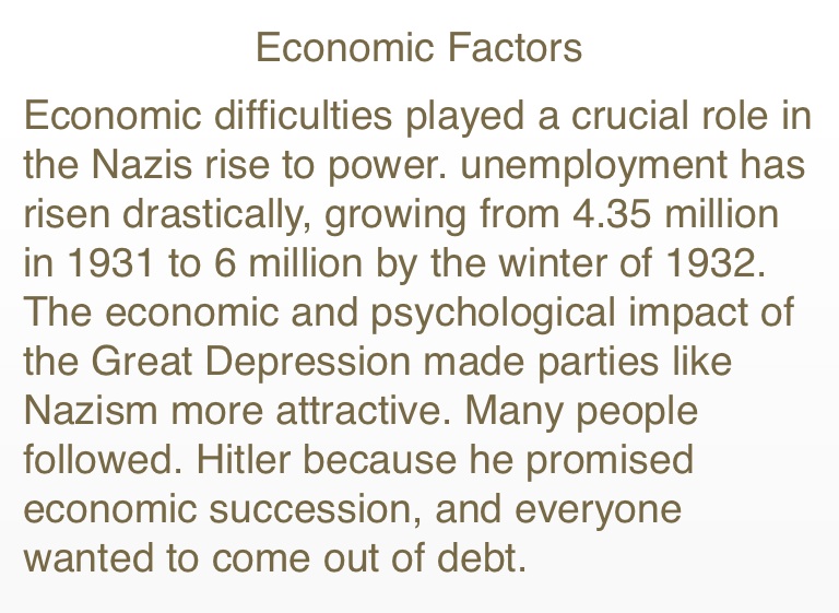 Economic difficulties played a crucial role in the Nazis rise to power. unemployment has risen drastically, growing from 4.35 million in 1931 to 6 million by the winter of 1932. The economic and psychological impact of the Great Depression made parties like Nazism more attractive. Many people followed. Hitler because he promised economic succession, and everyone wanted to come out of debt.