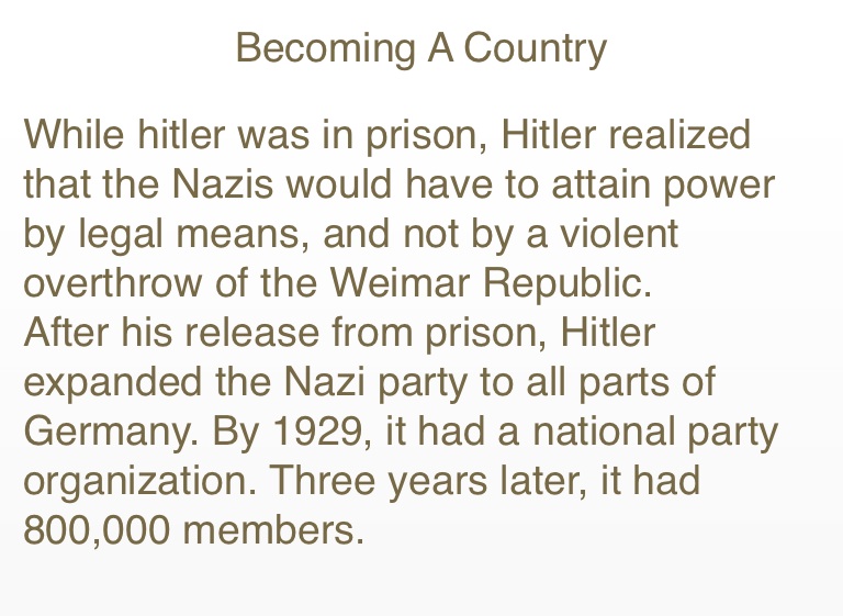 While hitler was in prison, Hitler realized that the Nazis would have to attain power by legal means, and not by a violent overthrow of the Weimar Republic.