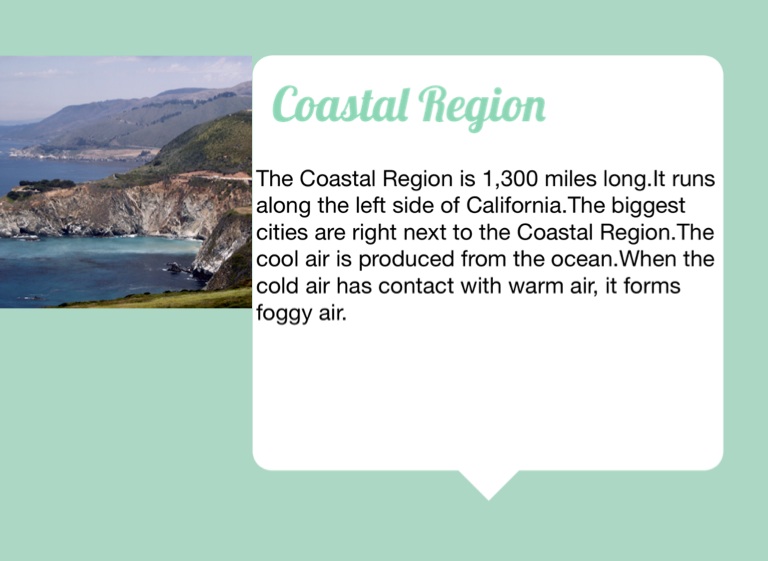 The Coastal Region is 1,300 miles long.It runs along the left side of California.The biggest cities are right next to the Coastal Region.The cool air is produced from the ocean.When the cold air has contact with warm air, it forms foggy air.