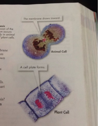 Cytokinesis divides the cytoplasm. In animal cells one cells forms too two. In plant cells a cell plate forms so each membrane formed has its own nucleus and organelles.