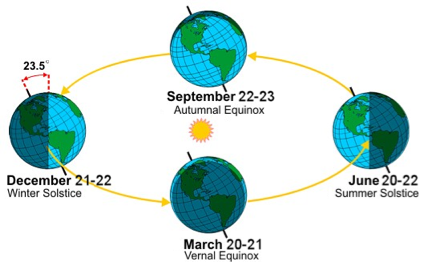 In winter, we are closest to the sun. This is called Perihelion. Winter is the opposite of summer, so instead of direct sunlight, we get all indirect sunlight. Indirect sunlight is when solar energy hits the earth at less than a 90° angle. The days get shorter and the temperatures drop.