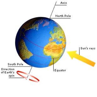 The Earth is tilted 23.5° on an imaginary line called an axis. The axis is always tilted towards the North Star. The Earth rotates on its axis, and one rotation takes 24 hours or 1 day. This is what causes day and night.