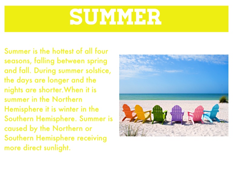 Summer is the hottest of all four seasons, falling between spring and fall. During summer solstice, the days are longer and the nights are shorter.When it is summer in the Northern Hemisphere it is winter in the Southern Hemisphere. Summer is caused by the Northern or Southern Hemisphere receiving more direct sunlight.