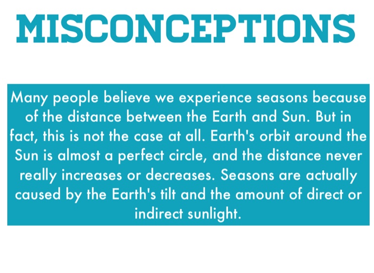 Many people believe we experience seasons because of the distance between the Earth and Sun. But in fact, this is not the case at all. Earth's orbit around the Sun is almost a perfect circle, and the distance never really increases or decreases. Seasons are actually caused by the Earth's tilt and the amount of direct or indirect sunlight.
