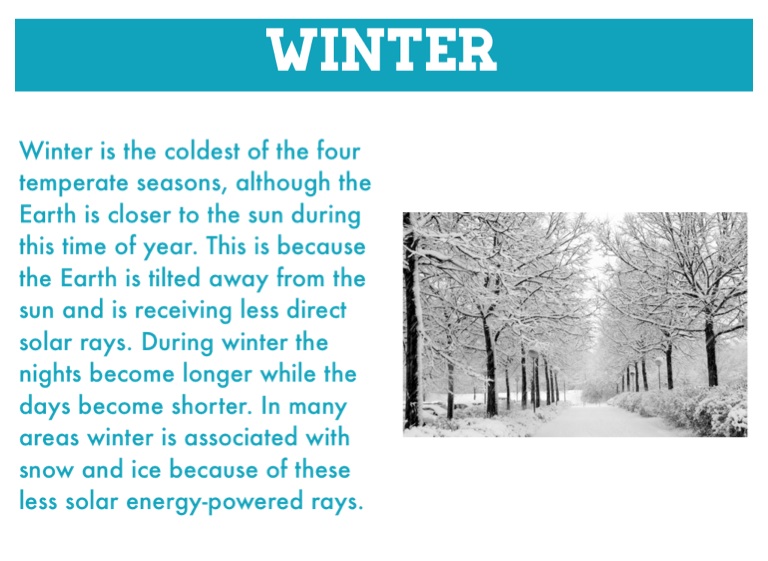 Winter is the coldest of the four temperate seasons, although the Earth is closer to the sun during this time of year. This is because the Earth is tilted away from the sun and is receiving less direct solar rays. During winter the nights become longer while the days become shorter. In many areas winter is associated with snow and ice because of these less solar energy-powered rays.