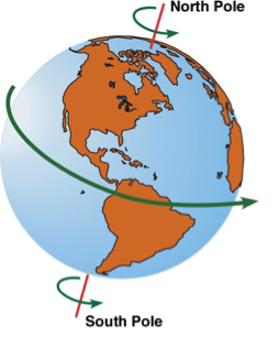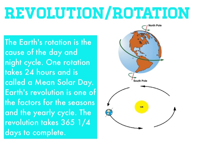 The Earth's rotation is the cause of the day and night cycle. One rotation takes 24 hours and is called a Mean Solar Day. Earth's revolution is one of the factors for the seasons and the yearly cycle. The revolution takes 365 1/4 days to complete.